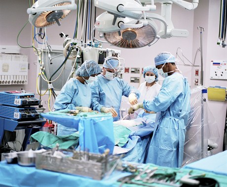 Las luces del quirófano están sobre la mesa para proporcionar una luz brillante y sin sombras durante la cirugía.